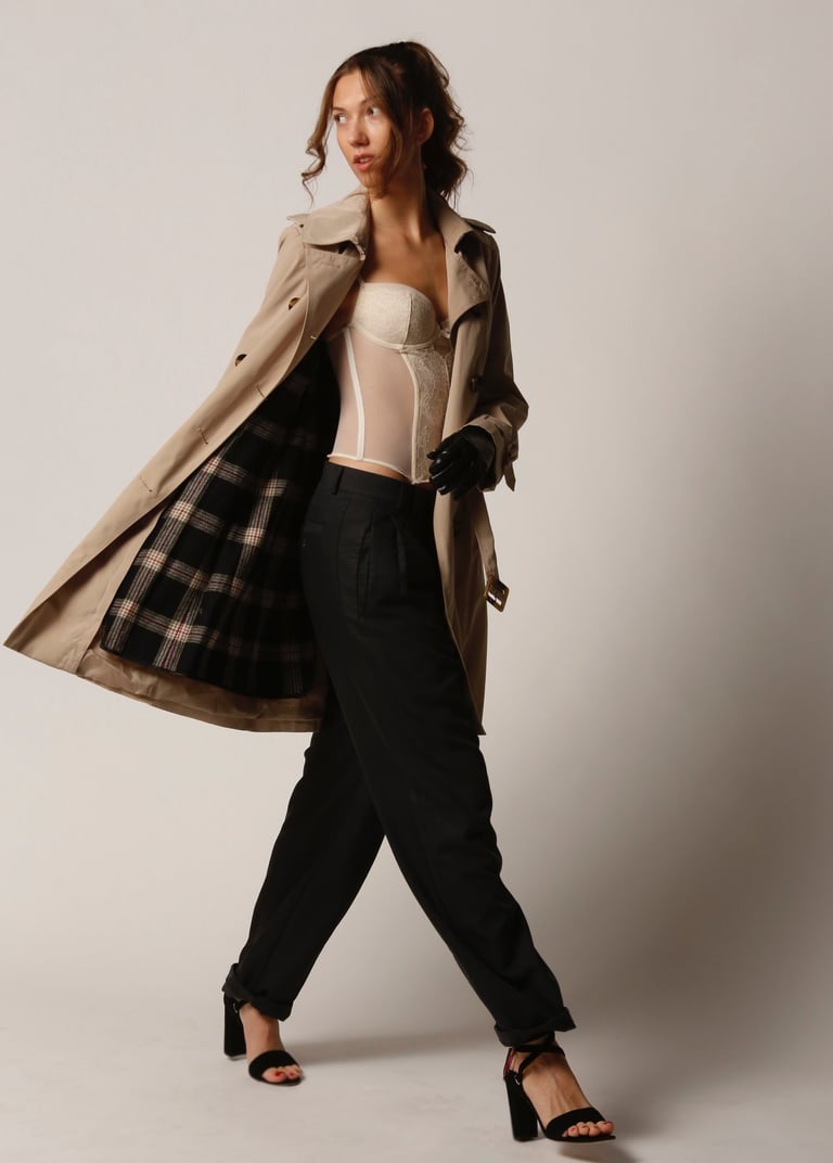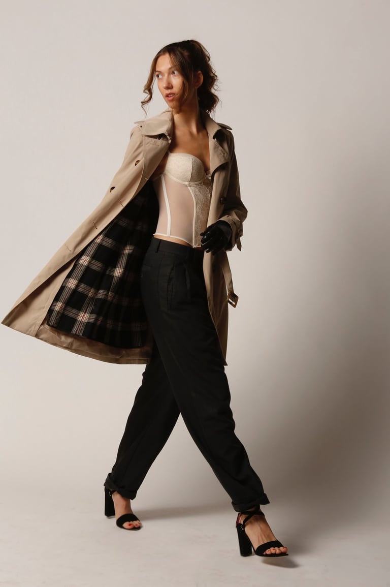 Style study centered on the timeless trench silhouette. Exploring contrasting textures and styles balances strength and femininity, to achieve an effortlessly confident look.